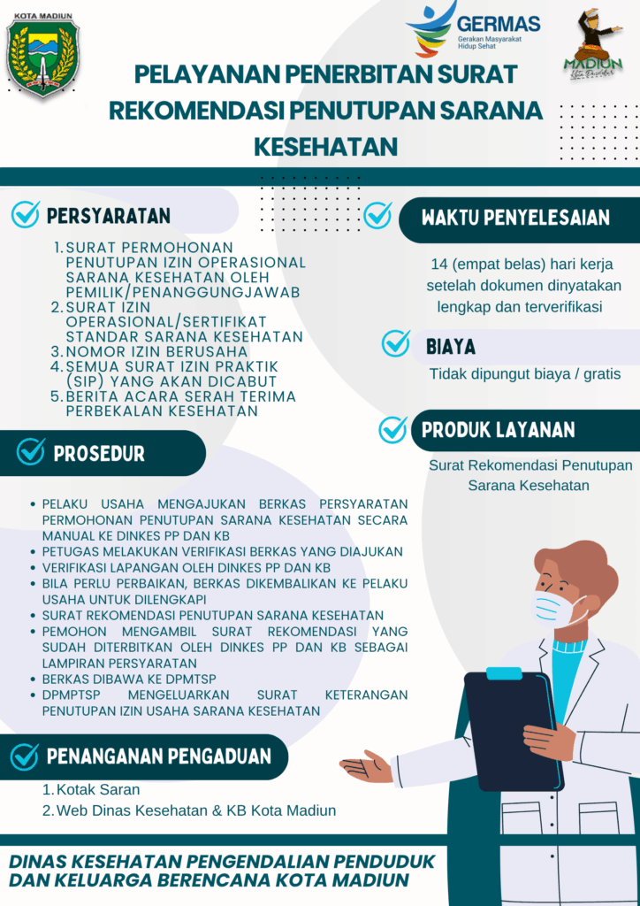 SOP/Produk Hukum SOP Penerbitan Surat Rekomendasi Penutupan Sarana Kesehatan Posted on 26 Maret 202521 Juli 2025 Author Dinas Kesehatan Komentar Dinonaktifkan pada SOP Penerbitan Surat Rekomendasi Penutupan Sarana Kesehatan SOP Penerbitan Surat Rekomendasi Penutupan Sarana KesehatanUnduh